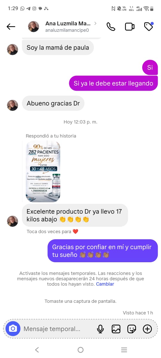 Atención disponible para adultos con sobrepeso u obesidad. Para saber si aplicas, se requiere verificación previa. *Los resultados visibles en 1-2 semanas dependen del perfil del paciente. Precio desde $1,400,000 Pesos COL.